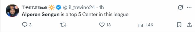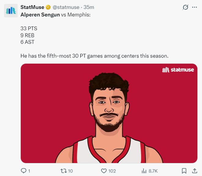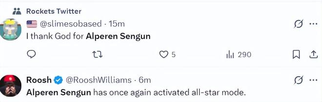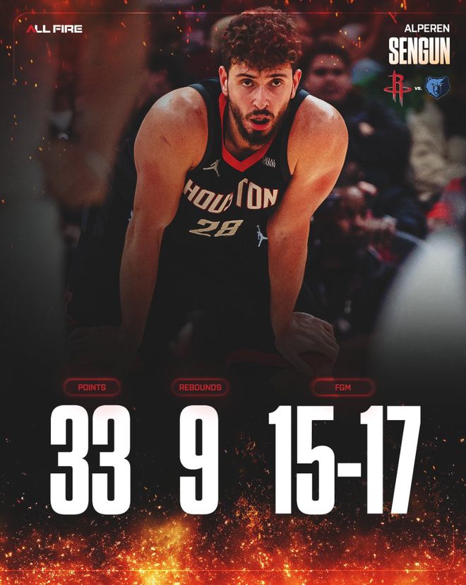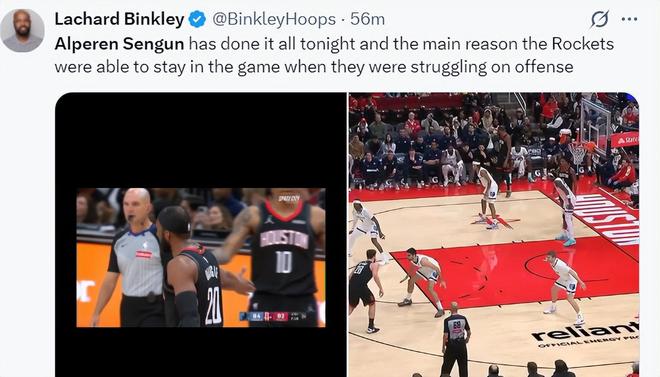 火箭队记兰德里-宾克利赛后写道:申京完成了所有任务,这也是火箭队在进攻陷入困境的情况下仍能拿下比赛的原因。
