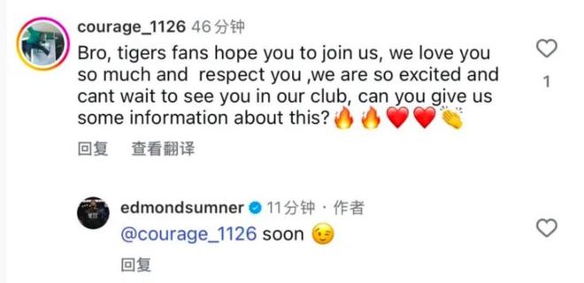 具体什么情况呢,有球迷在萨姆纳的社媒留言询问,大致意思是广东队球迷非常希望你能加盟球队,大家非常兴奋,期待能在俱乐部见到你,能给我们一些消息吗?