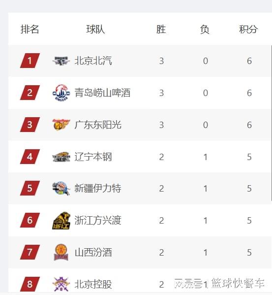 而四冠王辽宁队,他们上一轮比赛虽然输给北京队,球队的战绩变成2胜1负,不过,球队目前还是排在积分榜前四名。上一轮比赛,他们位居积分榜第三,不过,这一轮比赛过后,他们的排名被广东队反超了。新疆队则排在积分榜第5名,而卫冕冠军广厦队,他们在上一轮避免连败后,球队的战绩也变成2胜1负,目前暂居积分榜第6位。山西队则位居第7,第8名则属于北控队。