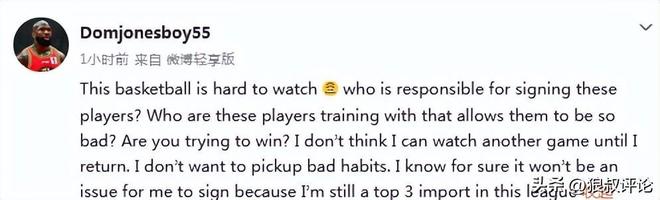 北京时间1月10日,前吉林男篮名宿外援琼斯更新社媒发文:“这场球太难看了。谁负责签的这些球员?谁把他们训练得这么差?你们想赢吗?在我回CBA之前,我不会再看这样的比赛了,我不想养成坏习惯。我确信签约对我来说不是问题,因为我仍然联盟前3名。”