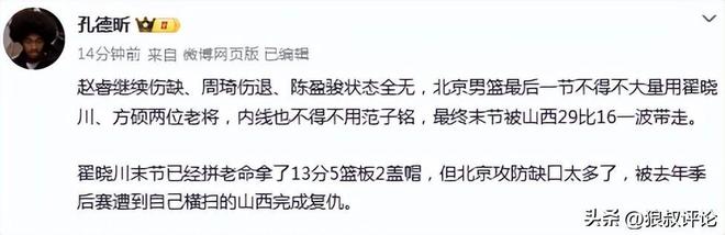翟晓川末节已经拼老命拿了13分5篮板2盖帽,但北京攻防缺口太多了,被去年季后赛遭到自己横扫的山西完成复仇。