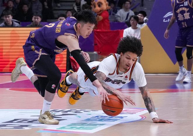 1月26日,北京控股队球员廖三宁(左)和长白山恩都里队球员威尔逊在比赛中拼抢。新华社记者 雒圆 摄