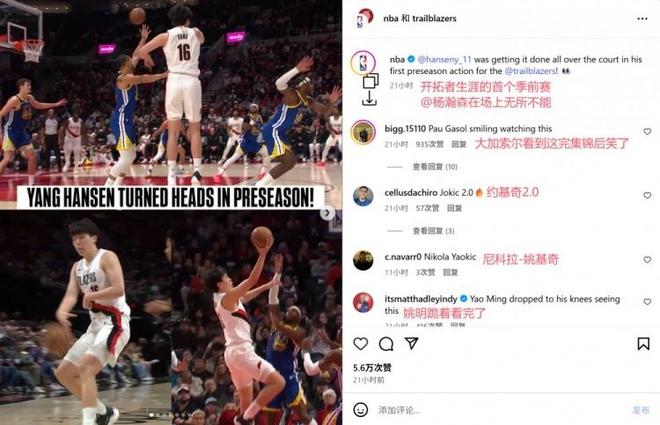 然而,美国网友和球迷和我们大不相同,他们却对杨瀚森四场季前赛的表现感到非常满意,在评论区对杨瀚森是赞不绝口,比如最近美国网友纷纷议论,有的说:开拓者首个季前赛,杨瀚森在场上无所不能,大加索尔看到这个完集笑了,还有好几个美国网友说,这是约基奇2.0,他梦还说杨瀚森年轻又帅气,大家赶紧给杨瀚森起个绰号吧。