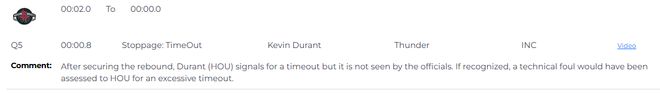 NBA官方裁判报告认定:在抢到篮板后,休斯顿火箭队的杜兰特示意请求暂停,但裁判并未注意到这一信号。若该暂停请求被裁判认可,火箭队将因 “超额请求暂停” 被判罚一次技术犯规。