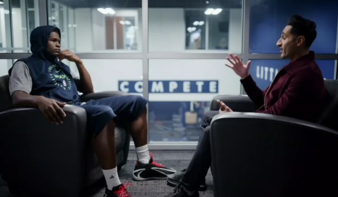 爱德华兹:是啊,我当时还拍了好几张照片。按理说,替补席上是不准玩手机的,这是规定。但我当时心想:“管他什么规定呢,去他的规定。”我从八年级起就和安德玛签约了,那时候我就总穿库里的球鞋。几年后我参加了他的篮球训练营,后来又进入NBA,还和他一起征战奥运会。看着他为人处世那么随和亲切,再看到他脚上穿着我的签名鞋 —— 那一刻,我感觉自己又变回了那个小男孩。所以我当时必须得拍几张照片留念。就跟普通人见到明星路过一样,赶紧掏出手机抓拍,当时我就是那个样子。