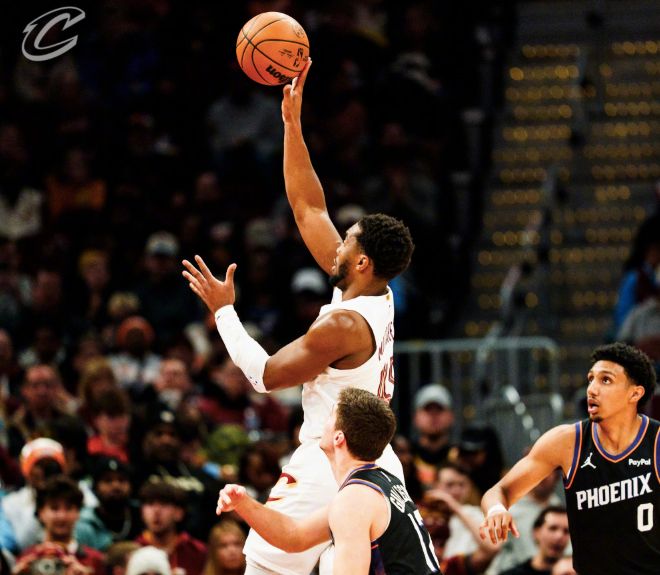 首节比赛,奥尼尔和狄龙上来命中三分,米切尔内突外投连续拿分做出回应,梅里尔连续命中2记三分,骑士轰出16-0攻势,狄龙三分止血,可骑士还在不断拿分,莫布利内线连续扣篮,米切尔打成2+1,一度取得19分领先,吉列斯皮三分命中止血,首节太阳21-37落后;次节比赛,米切尔上来继续拿分,阿伦篮下打进,骑士取得46-26领先,随后太阳展开反扑,布克突破打进成功将分差追至10分,米切尔拿分带队稳住局势,狄龙也在不断拿分,米切尔三分飙进,随后打成2+1,半场打完骑士67-54领先太阳。