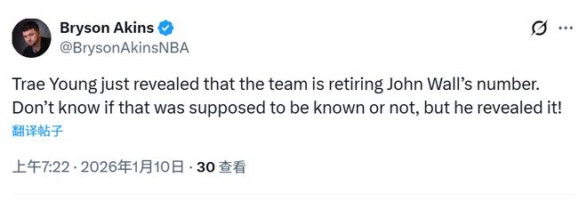 采访中,作为奇才的新面孔,特雷-杨还顺带爆了个料,他提到奇才计划退役沃尔的2号球衣。多位记者转发并感谢了特雷-杨的爆料。