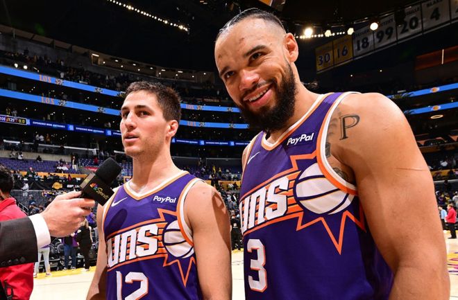 正如布克所说,吉莱斯皮是太阳队“训练有素的猎犬”这一新身份的另一位典范——意为聪明、顽强、坚韧。这位身高1米85、26岁的球员最初以双向合同进入联盟(先效力于丹佛掘金队,后加盟太阳队),本赛季是他首次获得标准合同的完整赛季,由于杰伦-格林(杜兰特交易中的另一位球员)因腿筋伤势只打了两场比赛,吉莱斯皮获得了超出预期的上场时间,迎来了爆发:场均贡献13.2分、4.8次助攻和1.5次抢断。