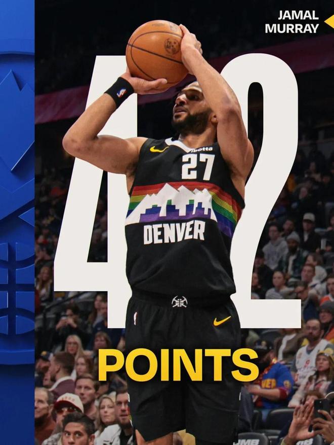 这场比赛,约基奇继续缺席,然后贾马尔穆雷再次交出了巨星级表现:全场出战39分钟,投篮24中15,三分8中5,罚球8中7,拿下42分3篮板6助攻2抢断2盖帽。