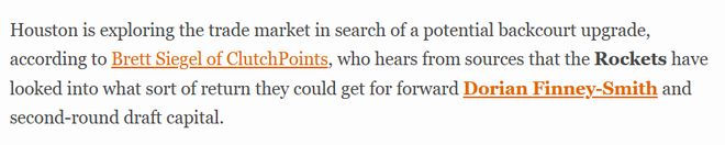 北京时间1月23日,据名记西格尔报道,休斯顿火箭队正试水交易市场,寻求补强球队后场实力。消息人士透露,火箭方面已在评估,若将锋线球员芬尼-史密斯与次轮选秀权作为筹码,能够换回怎样的交易回报。