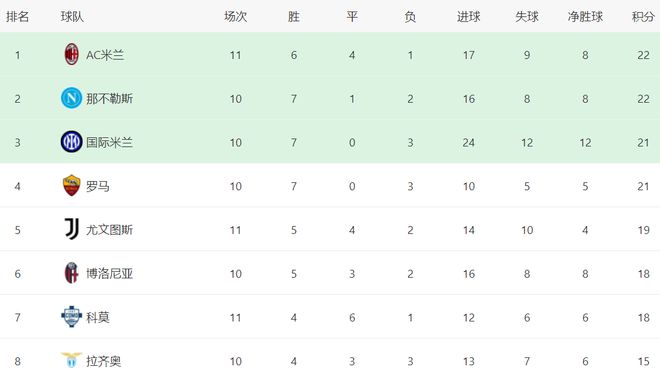 在积分榜上,AC米兰登上了榜首位置。AC米兰总积分达到22分,和那不勒斯积分相同,但在净胜球一样的情况下进球数占优,得以排名第1。不过,AC米兰比那不勒斯多赛一场,分分钟有可能被挤下去。国际米兰以21分排名第3。罗马也是21分,排名第4。尤文图斯19分,排名第5。博洛尼亚和科莫都是18分,排名第6和第7名。