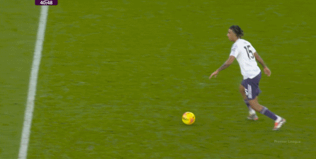 所以在这种情况下,维拉把曼联吸引过来,用马丁内斯的大脚找罗杰斯的头顶,这里被约罗顶了回去: