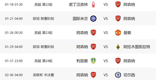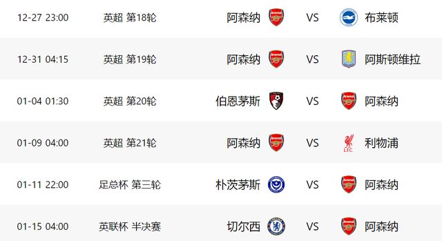 在足总杯第3轮比赛中,阿森纳将做客对阵朴茨茅斯,由于2队实力差距明显,阿森纳哪怕用替补,都有很大机会过关。之后就是联赛杯半决赛首回合比赛,阿森纳先踢客场,对手是同城死敌切尔西,如果能够在客场全身而退,阿森纳就有很大机会晋级决赛了。2场杯赛之后,阿森纳就要在联赛中客场对阵诺丁汉森林,好在对手本赛季状态低迷,阿森纳应该有把握拿到3分。在1月下旬,欧冠重新开战,阿森纳将做客对阵国米,如果能战胜对手,阿森纳就将提前锁定小组前二。之后的联赛,阿森纳要在主场迎战曼联。欧冠小组赛收官战,阿森纳将在主场对阵弱旅阿拉木图凯拉特,随后2场比赛,阿森纳的对手分别是利兹联和切尔西(联赛杯半决赛第二回合)。