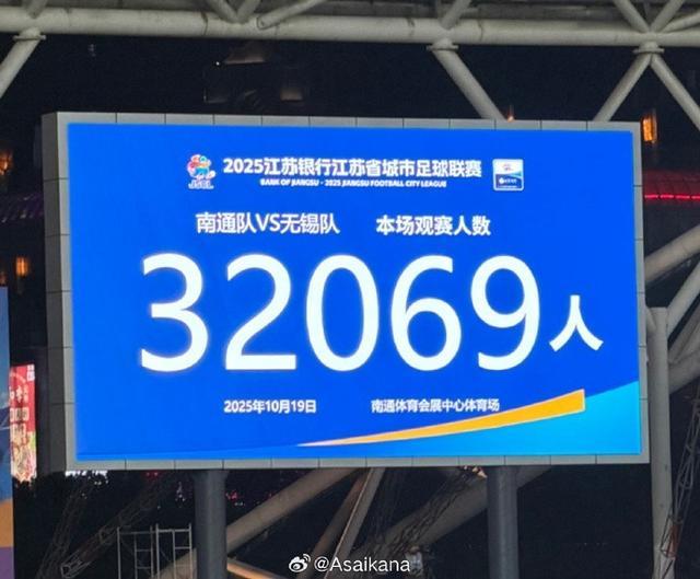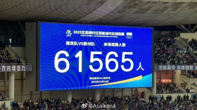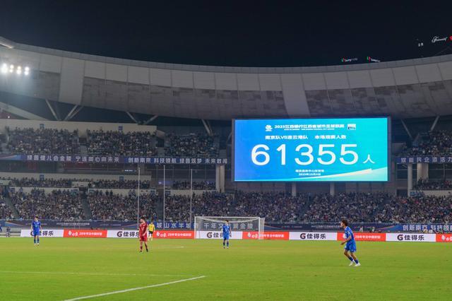 10月4日,大屏幕显示本场比赛共有61355名球迷到场观赛。 “苏超”四分之一决赛中,南京队主场与连云港队在常规时间1比1战平,通过点球大战,南京队以5比3的总比分战胜连云港队,晋级半决赛。 新华社发