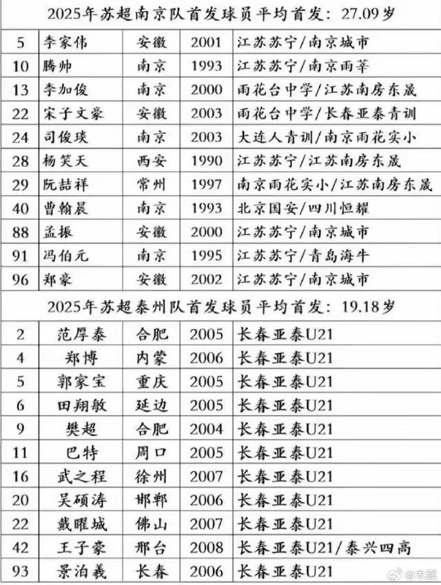 也有网友比较了“苏超”南京队、泰州队的球员构成。
