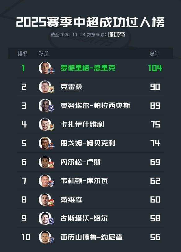 11月22日,2025赛季中超联赛落下战幕。根据懂球帝统计的2025赛季中超球员成功过人榜:梅州客家外援罗德里格-恩里克以104次居首,近四个赛季罗德里格-恩里克已三次成为“中超过人王”。