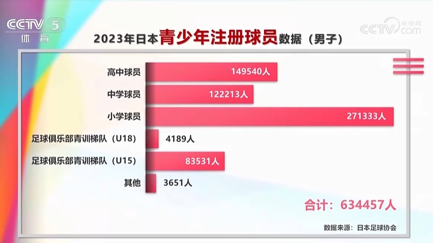 根据日本足协的数据,2023年日本男足青少年注册球员合计634457人。